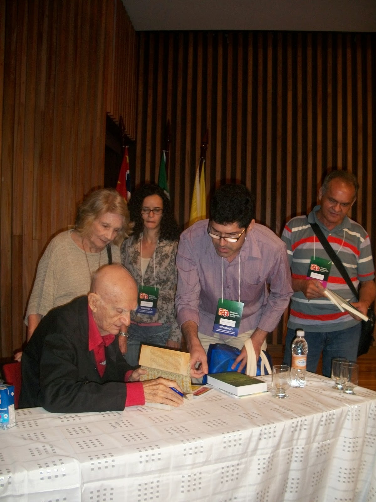 | Durante o simpósio da Faculdade de Comunicação da Paulus, sob o olhar de dona Zélia, esposa de Ariano. |